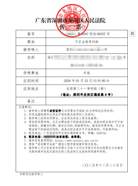广东省深圳市龙岗区人民法院受理的一起不正当竞争纠纷案件【案号:(2025)粤0307民初80357号】已定于2026年1月23日开庭审理。北京鼎友律师事务所新锐律师郑律师受托领衔代理本案,以扎实的专业功底和出色的实战能力,勇担民事案件代理重任。