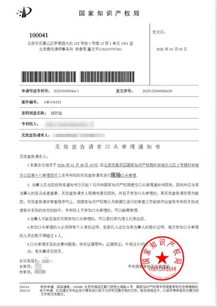 国家知识产权局已下发口头审理通知书(案件编号:6W134323),明确将于 2026 年 1 月 28 日,在国家知识产权局开展现场审理。