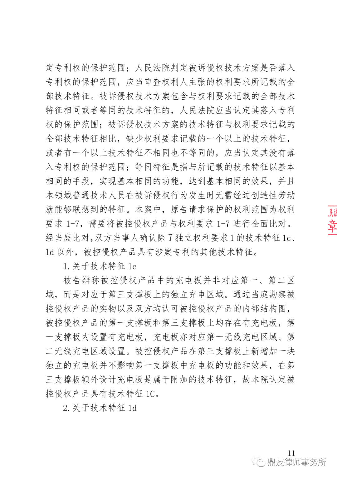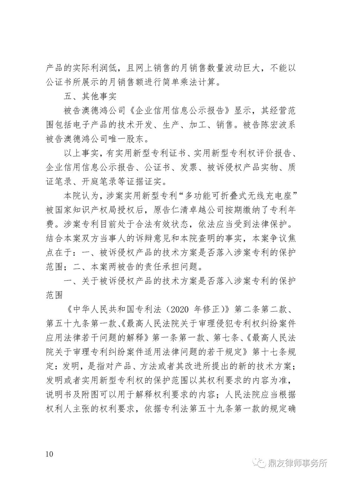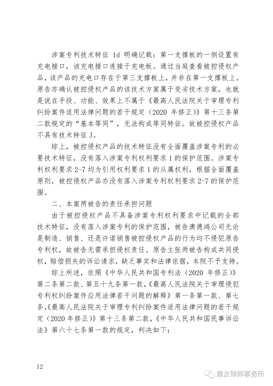 2022年1月5日,深圳市澳德鸿电子科技有限公司及其法人陈先生被深圳市仁清卓越科技有限公司起诉侵犯其名称为“多功能可折叠式无线充电座”实用新型的专利权(专利号ZL201921628647.3)。我所作为深圳市澳德鸿电子科技有限公司及其法人陈先生的委托代理方积极应诉,最终我方不侵权抗辩意见得到了深圳市中级人民法院认可,本案件获得一审胜诉。